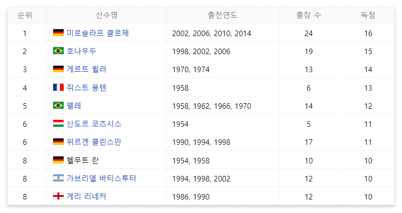 4위의 쥐스트 퐁텐이란 선수는 1958년도 단 1번의 월드컵 출전으로 6경기에서 13골을 기록하였으며, 축구 레전드인 브라질의 축구영웅 펠레는 4번의 월드컵에서 14경기 12골을 기록하였습니다.