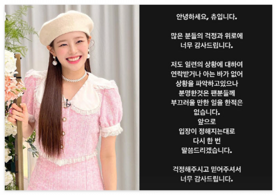 하지만, 츄는 28일 자신의 SNS에 '저도 일련의 상황에 대해 연락받거나 아는 바가 없어 상황을 파악하고 있으나 분명한 것은 팬분들께 부끄러울 만한 일을 한 적은 없다''고 자신의 입장을 밝혔습니다.