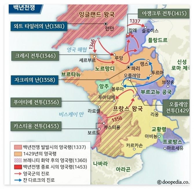 백년전쟁은 1337년부터 1453년까지, 116년 동안 벌어진 잉글랜드와 프랑스 왕국 간의 전쟁으로, 116년 동안 계속해서 전쟁을 치른 것은 아니며, 주요 전투로는 1346년 크레시 전투, 1356년 푸아티에 전투, 1415년 아쟁 크루 전투, 1429년 오를레앙 전투, 1453년 카스티용 전투 등 5번의 전쟁이 있었습니다.