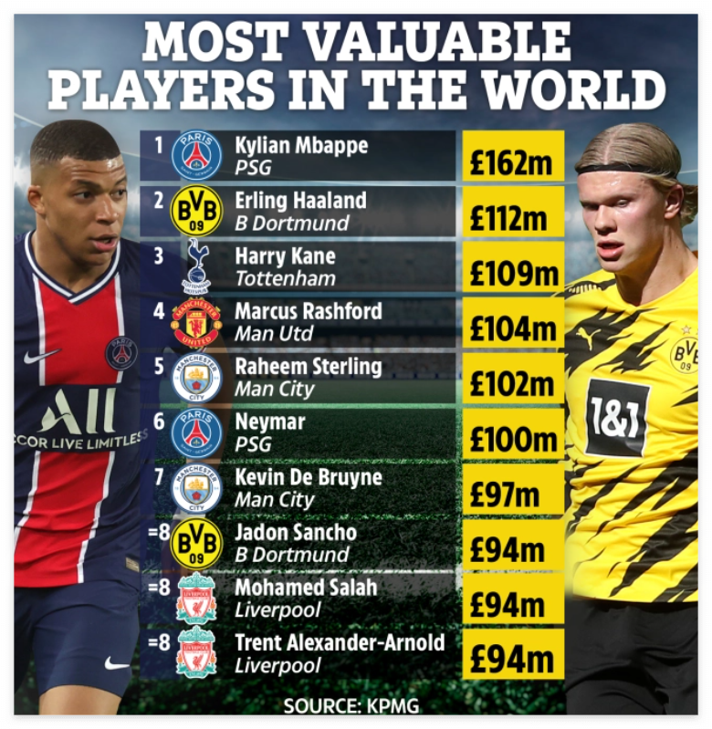 2021년 기준 킬리안 음바페는 축구선수 가치 세계 1위를 기록하고 있으며, 2위는 노르웨이 국적의 홀란드, 3위는 토트넘의 해리 케인으로, 이 두 선수는 전 세계에서도 최정상급의 선수 몸값을 자랑하고 있습니다.