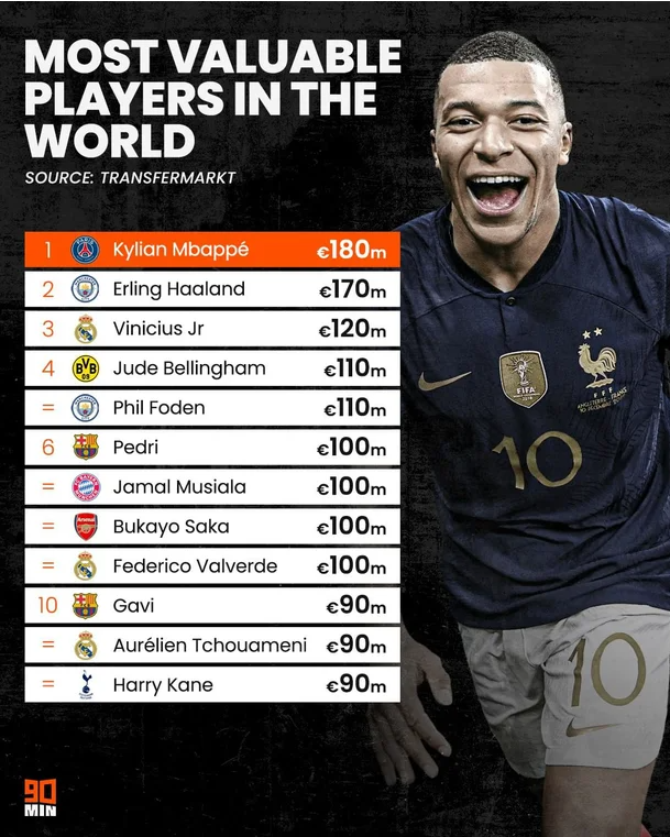 2022 카타르 월드컵에서 득점왕을 차지한 프랑스의 음바페가 12월 30일이 발표한 축구선수 몸값 순위에서 1위를 차지했습니다. 영국매체 '90 min'은 30일 통계 사이트 '트랜스퍼마켓'의 정보를 인용하여 세계 축구 선수 몸값 Top 10을 공개했습니다.