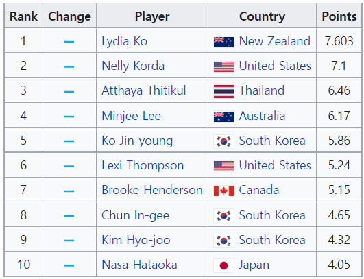 올해 앞도적인 점수를 받아 7.603 포인트로 압도적인 세계 1위를 기록중인 리디아고는 미국의 넬리 코다 7.1포인트를 많이 앞서고 있으며, 세계랭킹 4위는 호주 교포출신인 이민지선수이며, 세계랭킹 5위는 한국의 고진영 선수이며, Top 10위권에 한국선수가 3명이나 들어있을 정도로, LPGA에는 한국교포를 포함하여 5명이나 포진되어 있습니다.
