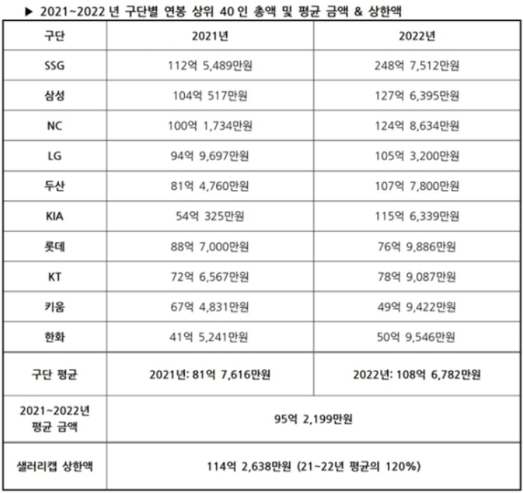 2021년, 2022년도 KBO 한국 프로야구 구단별 연봉 상위 40인 총액의 평균금액의 120%에 해당하는 금액을 2023년도 셀러리캡을 정하게 되었으며, 한국 프로야구의 첫 셀러리캡은 114억 2638만 원으로 결정되었습니다. 이번에 결정된 셀러리캡은 2025년까지 동일한 금액으로 적용되게 됩니다.