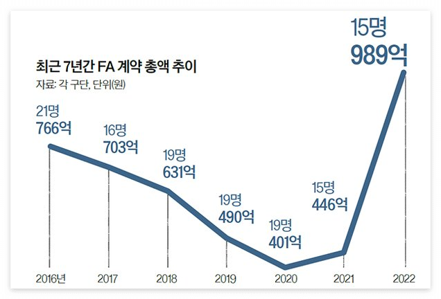 2022년도 FA는 역대 최고인 1000억에 가까운 금액이 나왔으며, 총 15명의 FA계약 선수가 탄생하게 되었습니다. 특히, SSG 김광현(4년 151억 원)을 비롯하여, 기아 나성범(6년 150억 원) 양현종(4년 103억 원), 두산 김재환(4년 115억 원), LG 김현수(4+2 115억원), NC 박건우(6년 100억 원) 등의 대어급 선수들이 FA 계약을 체결하면서, 2021년 대비 2배 이상의 총액을 기록했습니다.