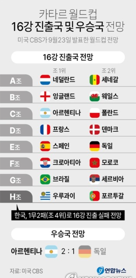 각 조별 16강 진출 국가로는 위와 같은 표로 말해줌을 알 수 있으며, 한국이 속한 H조는 전통의 강호 우루과이와 포르투갈이 본선 진출 가능성이 높은 것으로 나타났습니다. 아시아 국가는 100% 모두 탈락한다는 예상이 나왔으며, 준결승에서는 아르헨티나가 브라질을 꺾고 결승에 올라 독일을 꺾고 우승할 가능성이 높은 것으로 예측되었습니다.