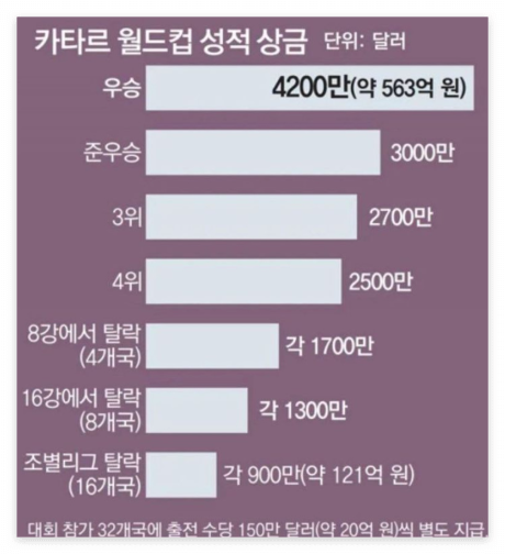 2022 카타르 월드컵 우승 상금. 한국 국가대표팀 포상금